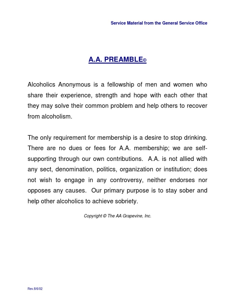 Aa Preamble Pdf Printable 12stepsofaa Com
