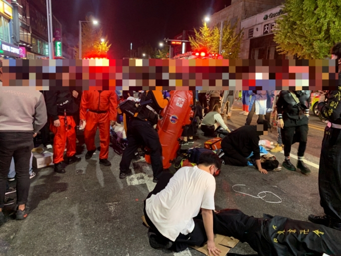 This is a picture sent by the survivors of Itaewon with bruises all over the body and difficulty breathing. 토끼 머리띠 남성으로 지목된 A씨는 지난달 31일 SNS. 이번엔 이태원에서 등장시민들 둘러싸고 환호해.